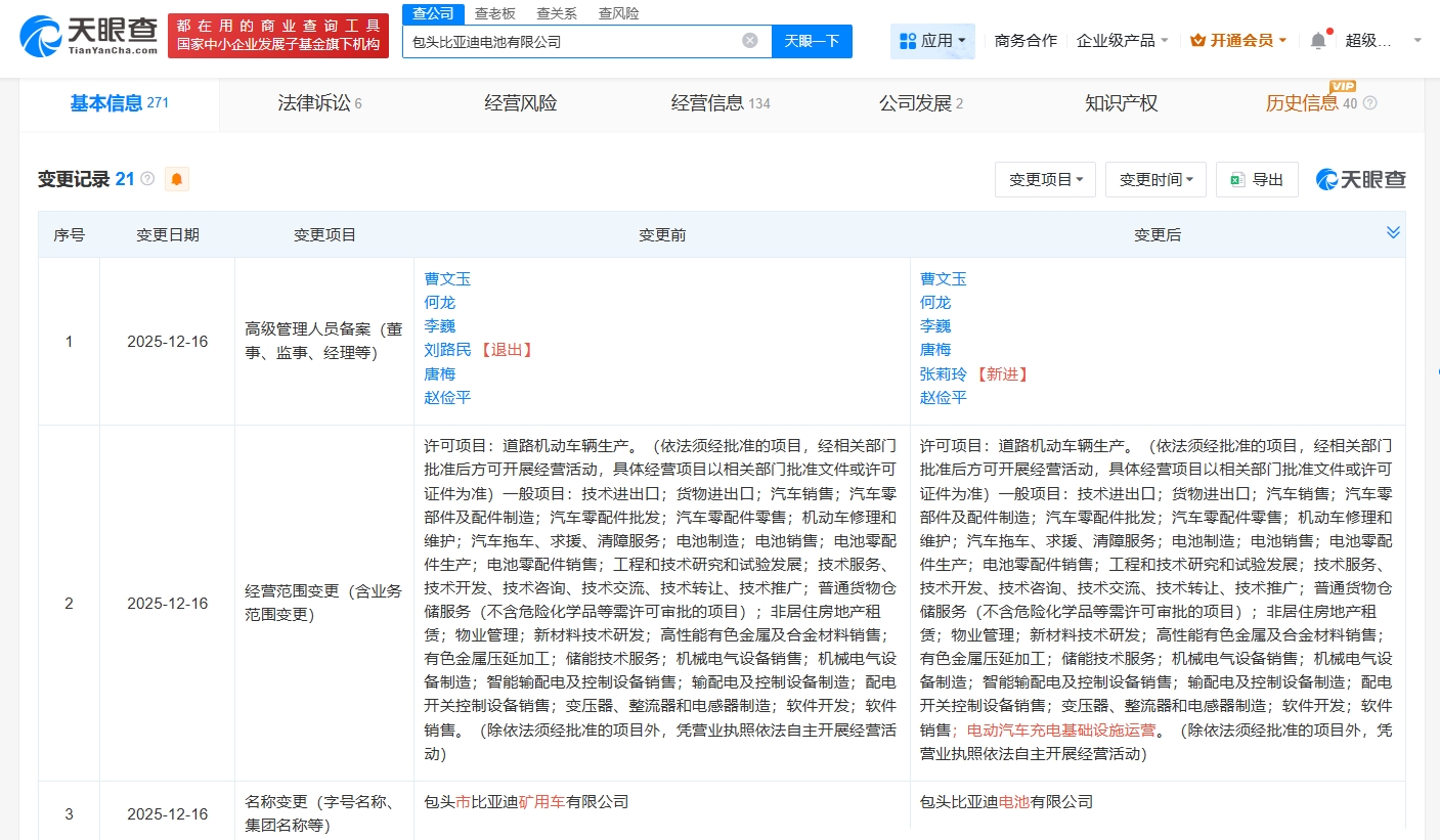 天眼查App显示,近日,包头市比亚迪矿用车有限公司发生工商变更,名称变更为包头比亚迪电池有限公司,经营范围新增电动汽车充电基础设施运营。