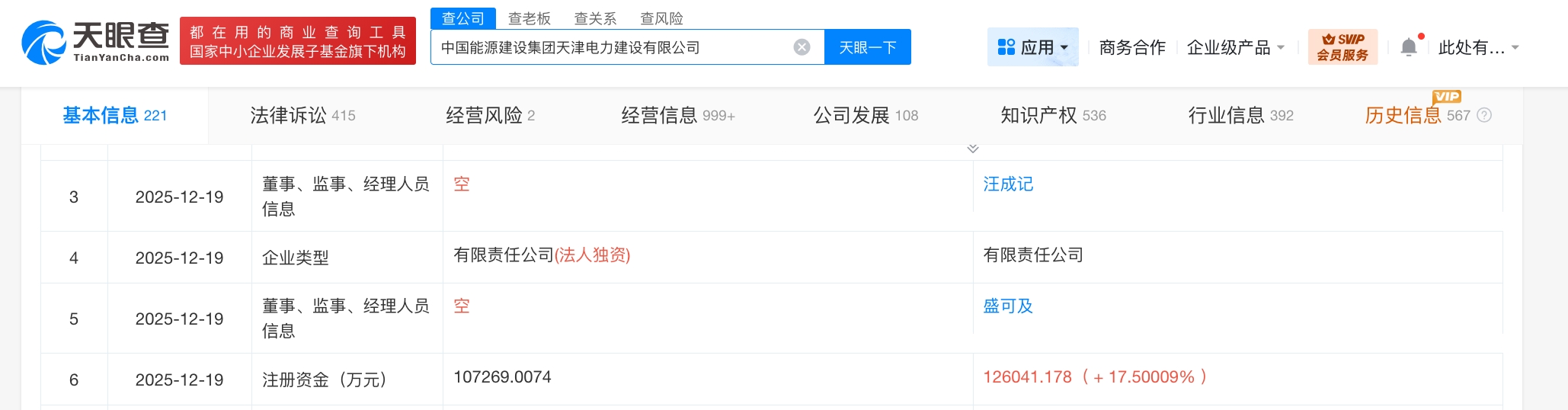 天眼查App显示,近日,中国能源建设集团天津电力建设有限公司发生工商变更,注册资本由约10.7亿人民币增至约12.6亿人民币,增幅约17.5%,同时,多位高管也发生变更。