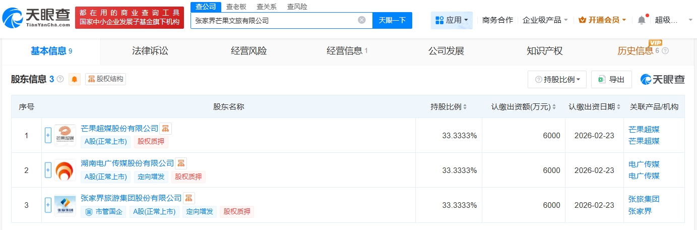 天眼查App显示,近日,张家界芒果文旅有限公司成立,法定代表人为周杨,注册资本1.8亿人民币,经营范围包括旅游开发项目策划咨询、游览景区管理、以自有资金从事投资活动、票务代理服务等。股东信息显示,该公司由芒果超媒(300413)、电广传媒(000917)、张家界旅游集团股份有限公司共同持股。