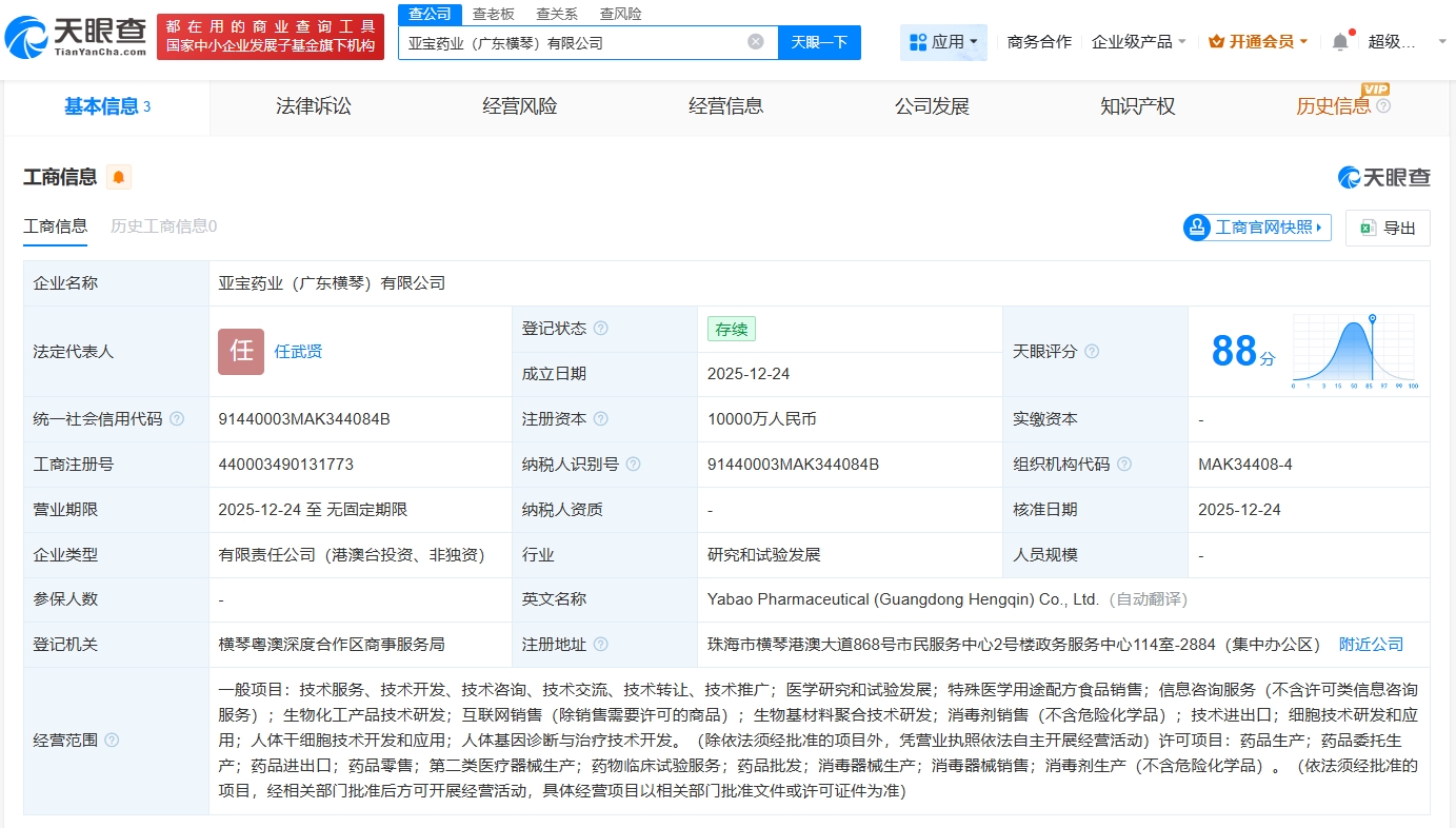 天眼查App显示,近日,亚宝药业(广东横琴)有限公司成立,法定代表人为任武贤,注册资本1亿人民币,经营范围包括医学研究和试验发展、生物化工产品技术研发、生物基材料聚合技术研发等。股东信息显示,该公司由亚宝药业(600351)、亚宝药业(澳门)有限公司共同持股。