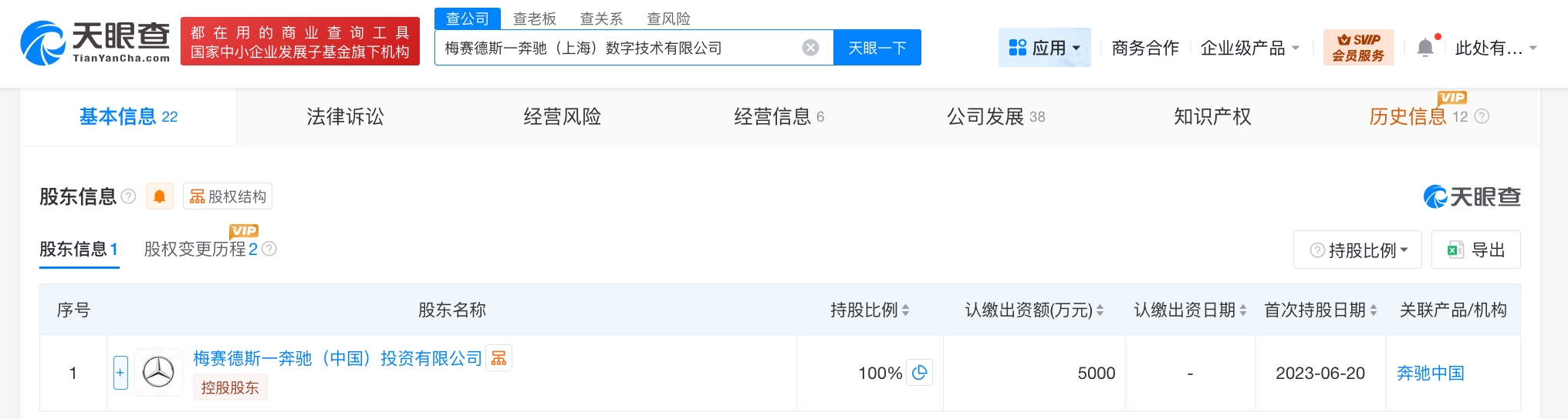 该公司成立于2023年6月,法定代表人为王忻,经营范围含软件开发、人工智能应用软件开发、人工智能基础软件开发、汽车零部件研发、网络技术服务、信息技术咨询服务、物联网技术服务、数据处理服务等。股东信息显示,该公司由梅赛德斯一奔驰(中国)投资有限公司全资持股。