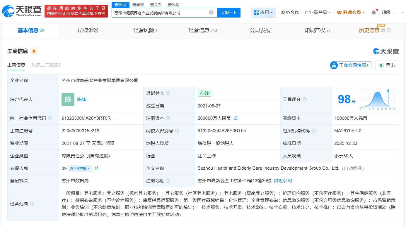 该公司成立于2021年8月,法定代表人为陈隆,经营范围包括养老服务、护理机构服务、养生保健服务等。股东信息显示,该公司由苏州国有资本投资集团有限公司、苏州苏高新集团有限公司、张家港市城市投资发展集团有限公司、苏州市吴江文化旅游发展集团有限公司共同持股。