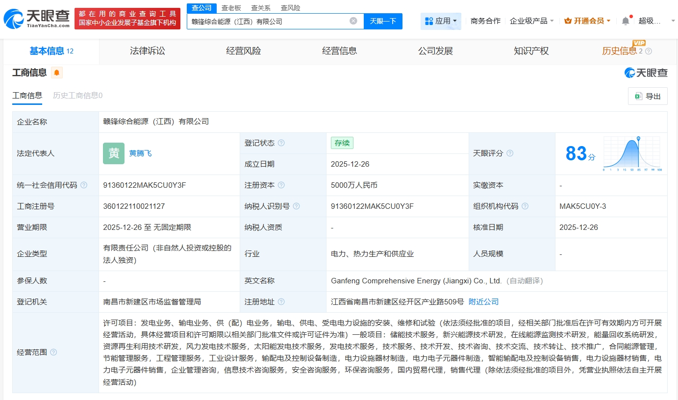 天眼查App显示,近日,赣锋综合能源(江西)有限公司成立,法定代表人为黄腾飞,注册资本5000万人民币,经营范围包括储能技术服务、新兴能源技术研发、在线能源监测技术研发、能量回收系统研发等。股东信息显示,该公司由赣锋锂业旗下赣锋综合能源(青海)有限公司全资持股。