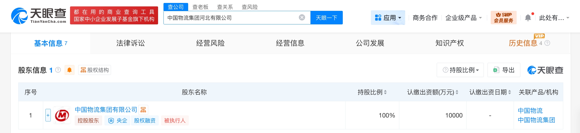 天眼查App显示,近日,中国物流集团河北有限公司成立,法定代表人为张鸿雁,注册资本1亿人民币,经营范围含道路货物运输、城市配送运输服务、国际货物运输代理、国内货物运输代理、国内船舶代理、包装服务、进出口代理、物联网应用服务、大数据服务、工业互联网数据服务等,由中国物流集团有限公司全资持股。