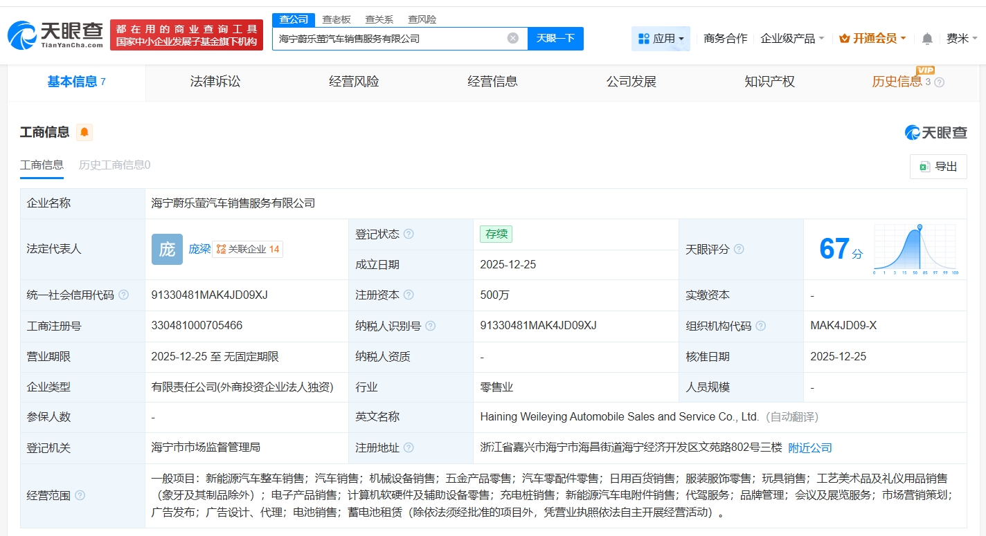 天眼查App显示,近日,海宁蔚乐萤汽车销售服务有限公司成立,法定代表人为庞梁,注册资本500万,经营范围包括新能源汽车整车销售、机械设备销售、五金产品零售等,由蔚来汽车销售服务有限公司全资持股。