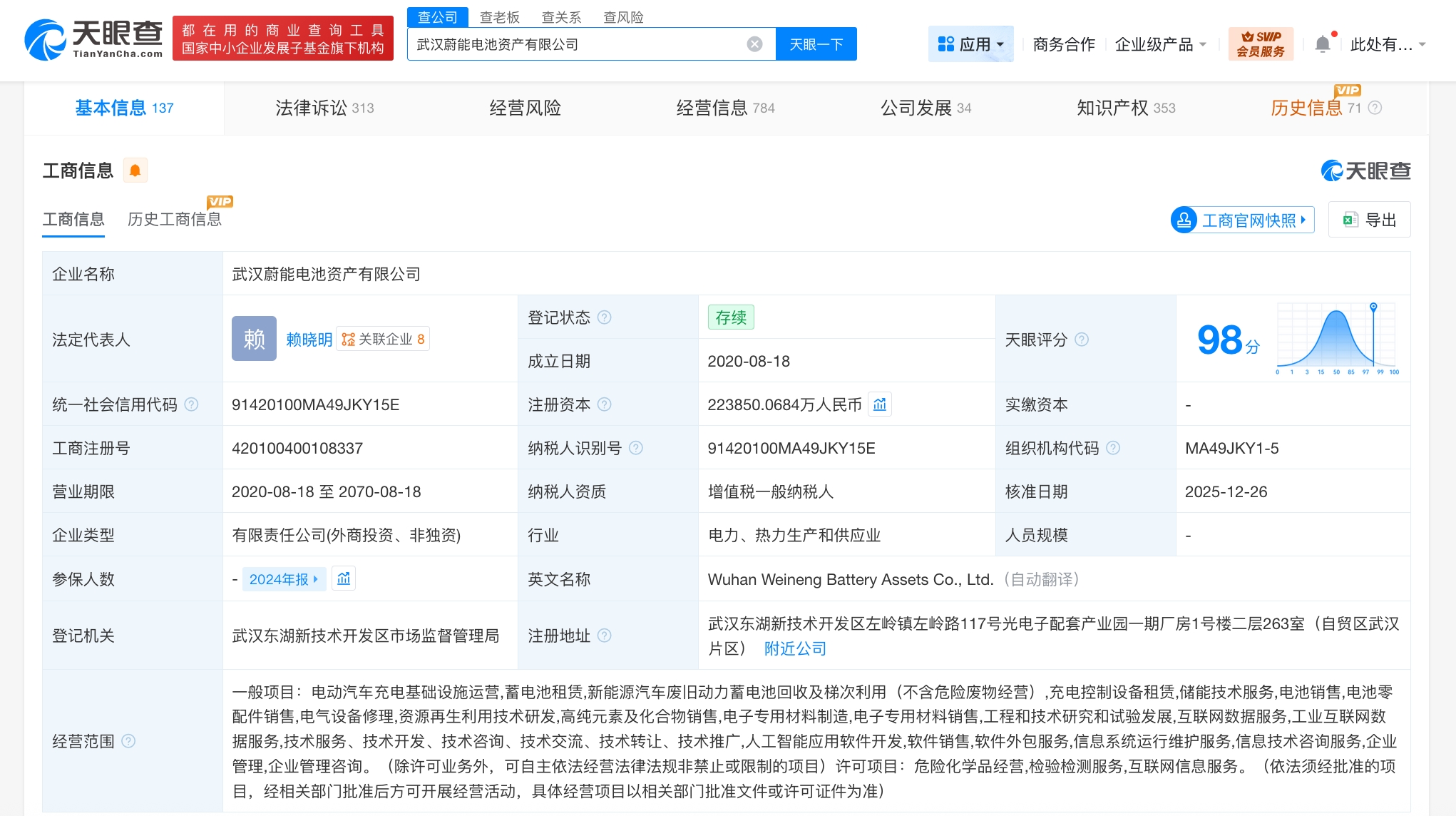 武汉蔚能电池资产有限公司成立于2020年8月,法定代表人为赖晓明,经营范围含电动汽车充电基础设施运营、蓄电池租赁、新能源汽车废旧动力蓄电池回收及梯次利用、人工智能应用软件开发、软件销售、软件外包服务、信息系统运行维护服务等,由蔚来控股有限公司、Angel Prosperity Investment HK I Limited、武汉光谷产业投资有限公司等共同持股。