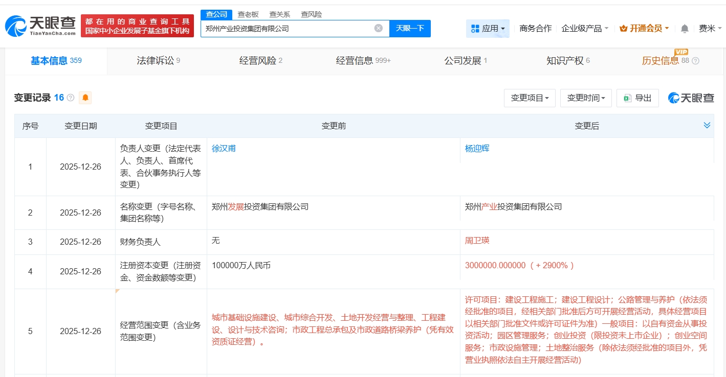 天眼查App显示,近日,郑州发展投资集团有限公司发生工商变更,企业名称变更为郑州产业投资集团有限公司,徐汉甫卸任法定代表人,由杨迎辉接任,同时,注册资本由10亿人民币增至300亿人民币,增幅2900%。