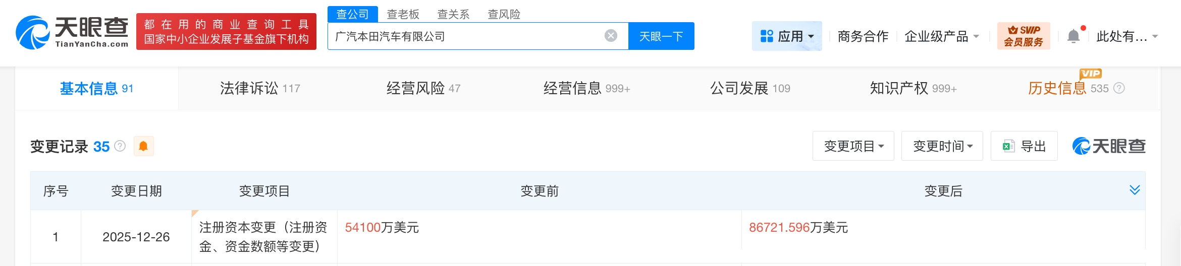天眼查App显示,近日,广汽本田汽车有限公司发生工商变更,注册资本由约5.4亿美元增至约8.7亿美元,增幅约60%。