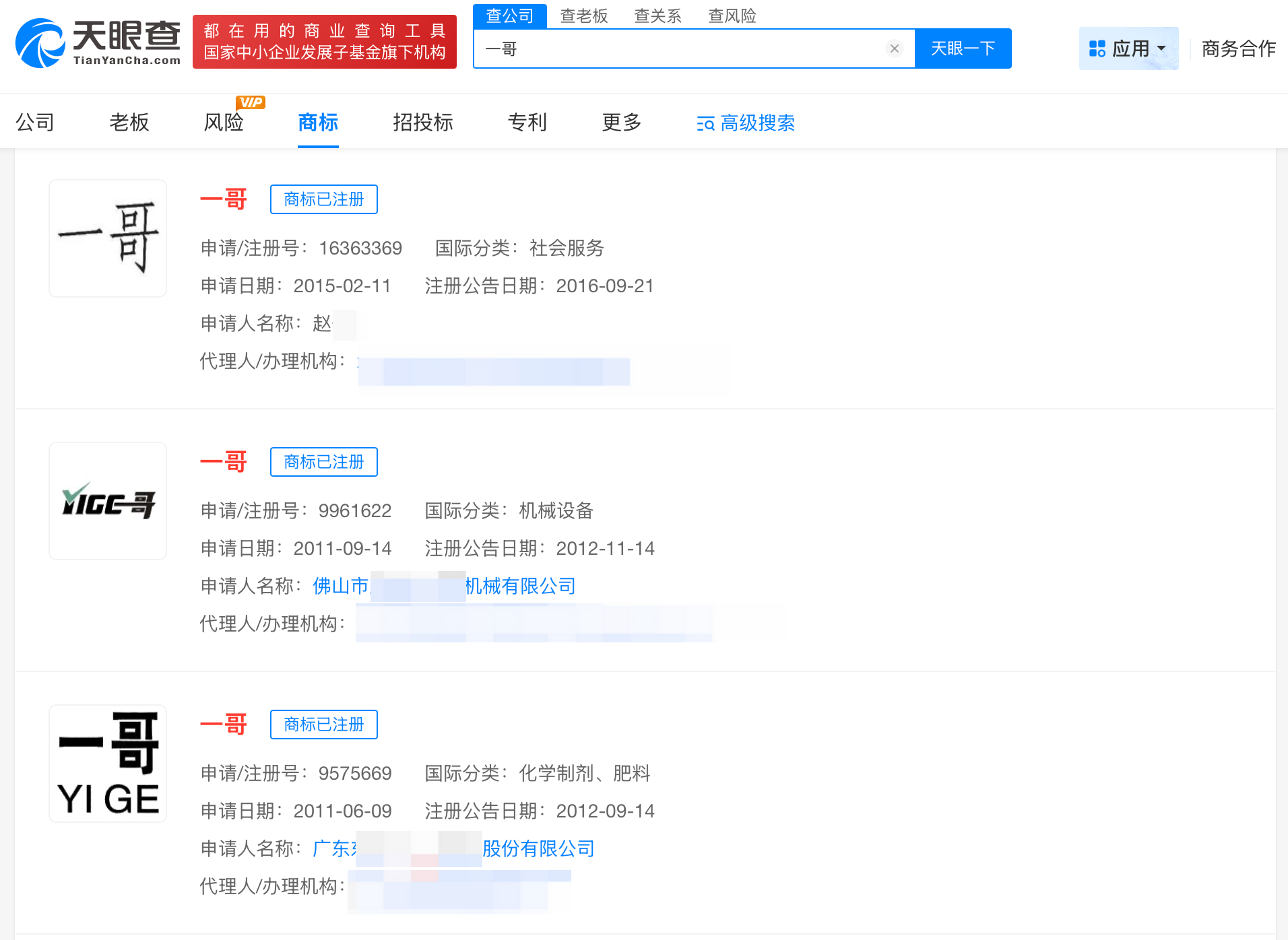 天眼查知识产权信息显示,“一哥”已被多方申请注册为商标,申请人包括佛山市某机械有限公司、自然人赵某等,国际分类涉及社会服务、机械设备等,当前商标状态多为已注册。