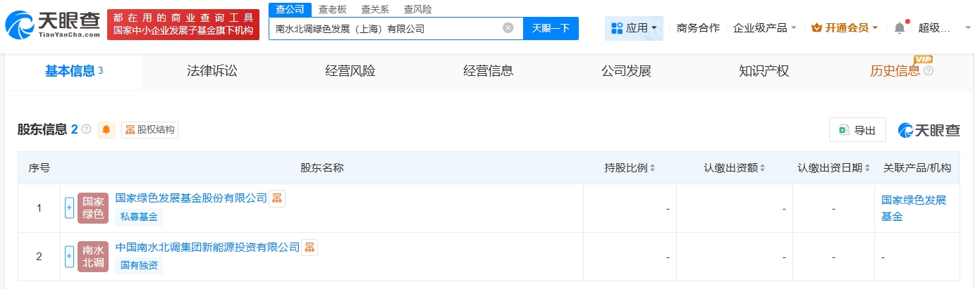 天眼查App显示,近日,南水北调绿色发展(上海)有限公司成立,法定代表人为徐宇华,注册资本38亿人民币,经营范围包括以自有资金从事投资活动、工程管理服务、储能技术服务、发电技术服务等。股东信息显示,该公司由国家绿色发展基金股份有限公司、中国南水北调集团新能源投资有限公司共同持股。