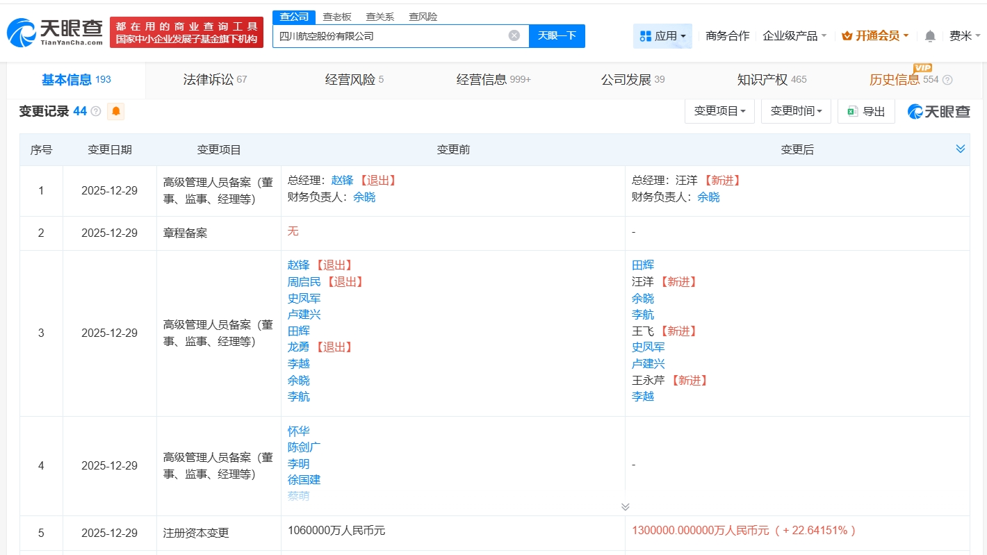 天眼查App显示,近日,四川航空股份有限公司发生工商变更,注册资本由106亿人民币增至130亿人民币,增幅约23%,同时,部分高管发生变更。