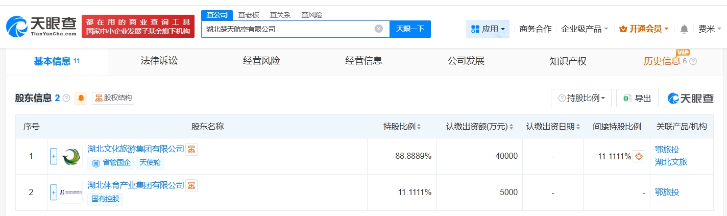 天眼查工商信息显示,近日,湖北楚天航空有限公司成立,法定代表人为李欣,注册资本4.5亿人民币,经营范围包括通用航空服务、民用航空器维修、民用机场运营等。股东信息显示,该公司由湖北文化旅游集团有限公司、湖北体育产业集团有限公司共同持股。