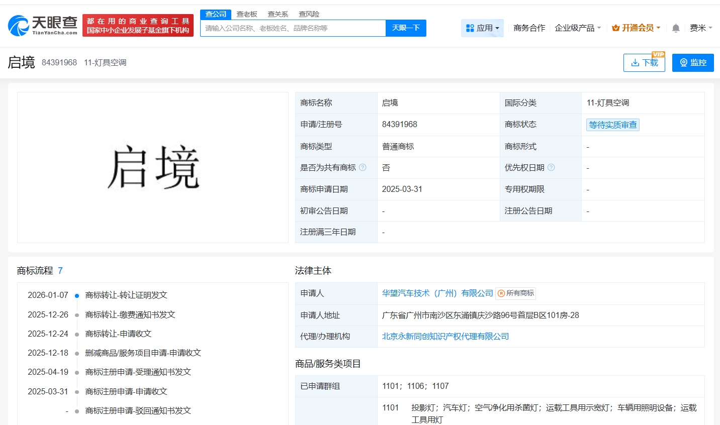 天眼查知识产权信息显示,近期,深圳引望智能技术有限公司将多枚“启境”商标转让给华望汽车技术(广州)有限公司,国际分类涉及灯具空调、运输工具、网站服务等,当前商标状态多为等待实质审查。