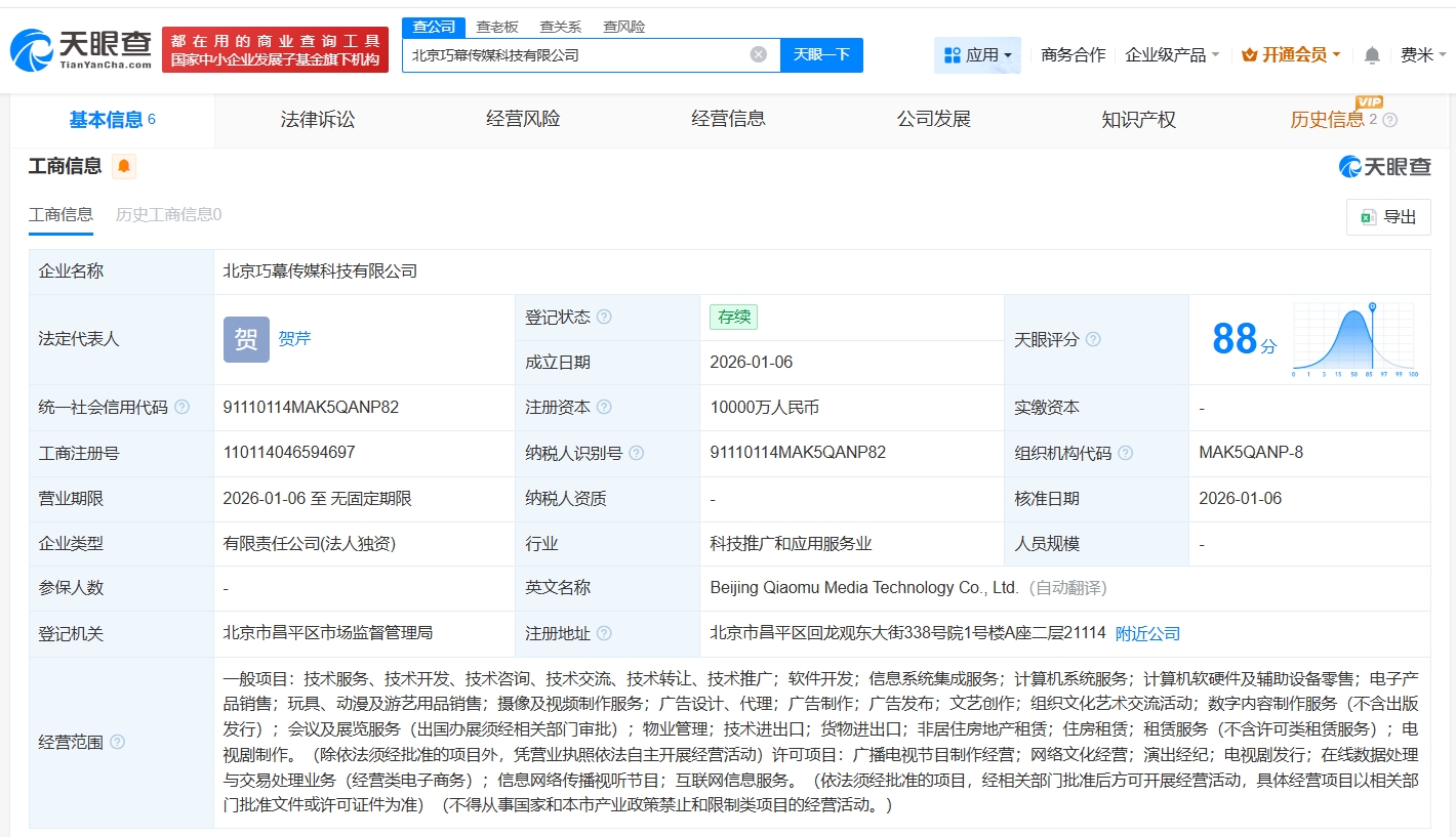 天眼查工商信息显示,近日,北京巧幕传媒科技有限公司成立,法定代表人为贺芹,注册资本1亿人民币,经营范围包括信息系统集成服务、计算机系统服务、计算机软硬件及辅助设备零售等。股东信息显示,该公司由北京字跳网络技术有限公司全资持股。