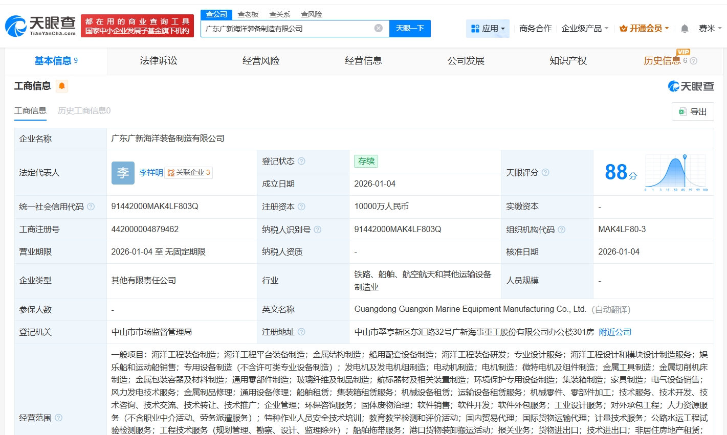 天眼查工商信息显示,近日,广东广新海洋装备制造有限公司成立,法定代表人为李祥明,注册资本1亿人民币,经营范围包括海洋工程装备制造、海洋工程平台装备制造、金属结构制造、船用配套设备制造等。股东信息显示,该公司由广东省广新控股集团有限公司、广东省粤新资产管理有限公司共同持股。