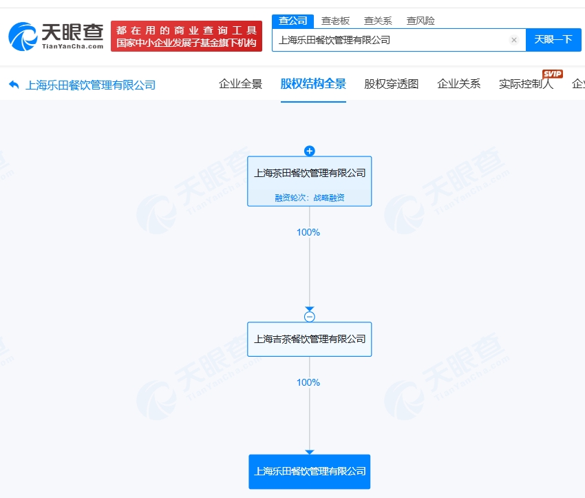 上海乐田餐饮管理有限公司成立于2018年9月,法定代表人为李明博,经营范围包括餐饮管理、货物进出口、技术进出口、企业管理等。股权全景穿透图显示,该公司由上海吉茶餐饮管理有限公司全资持股,后者由乐乐茶关联公司上海茶田餐饮管理有限公司全资持股。