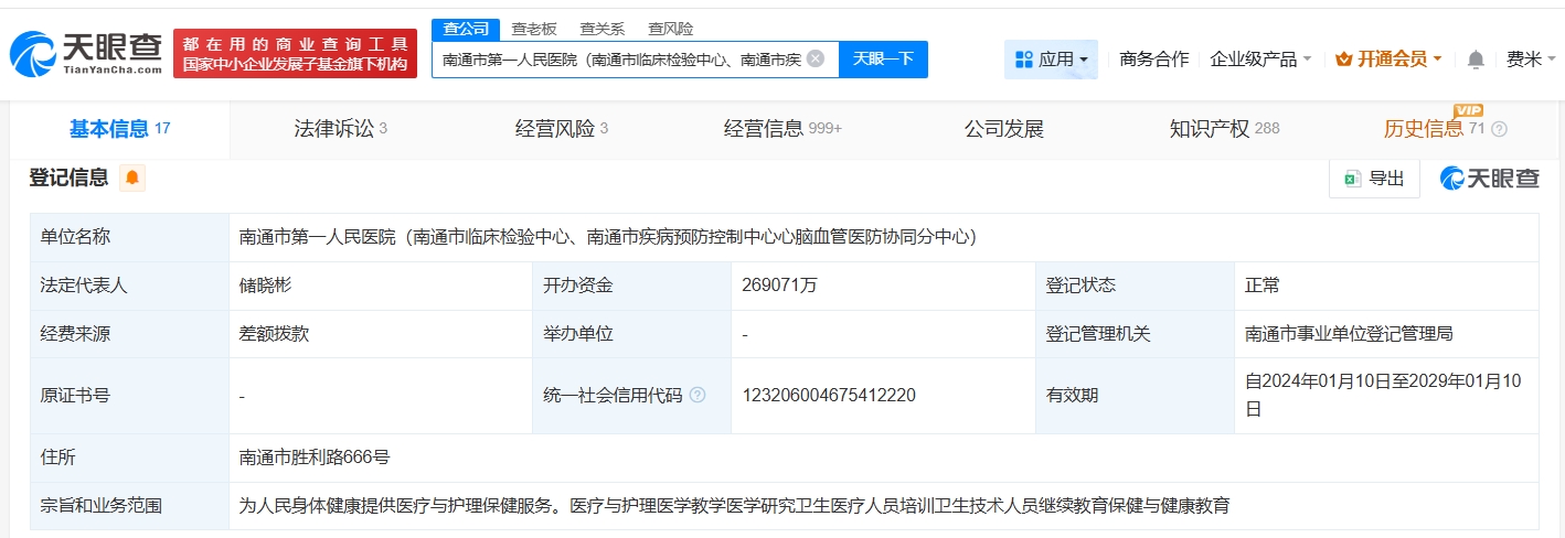 天眼查工商信息显示,涉事医院南通市第一人民医院(南通市临床检验中心、南通市疾病预防控制中心心脑血管医防协同分中心)法定代表人为储晓彬,开办资金约26.9亿人民币,宗旨和业务范围包括为人民身体健康提供医疗与护理保健服务等。天眼风险信息显示,该医院曾多次因医疗损害责任纠纷、医疗服务合同纠纷被起诉。