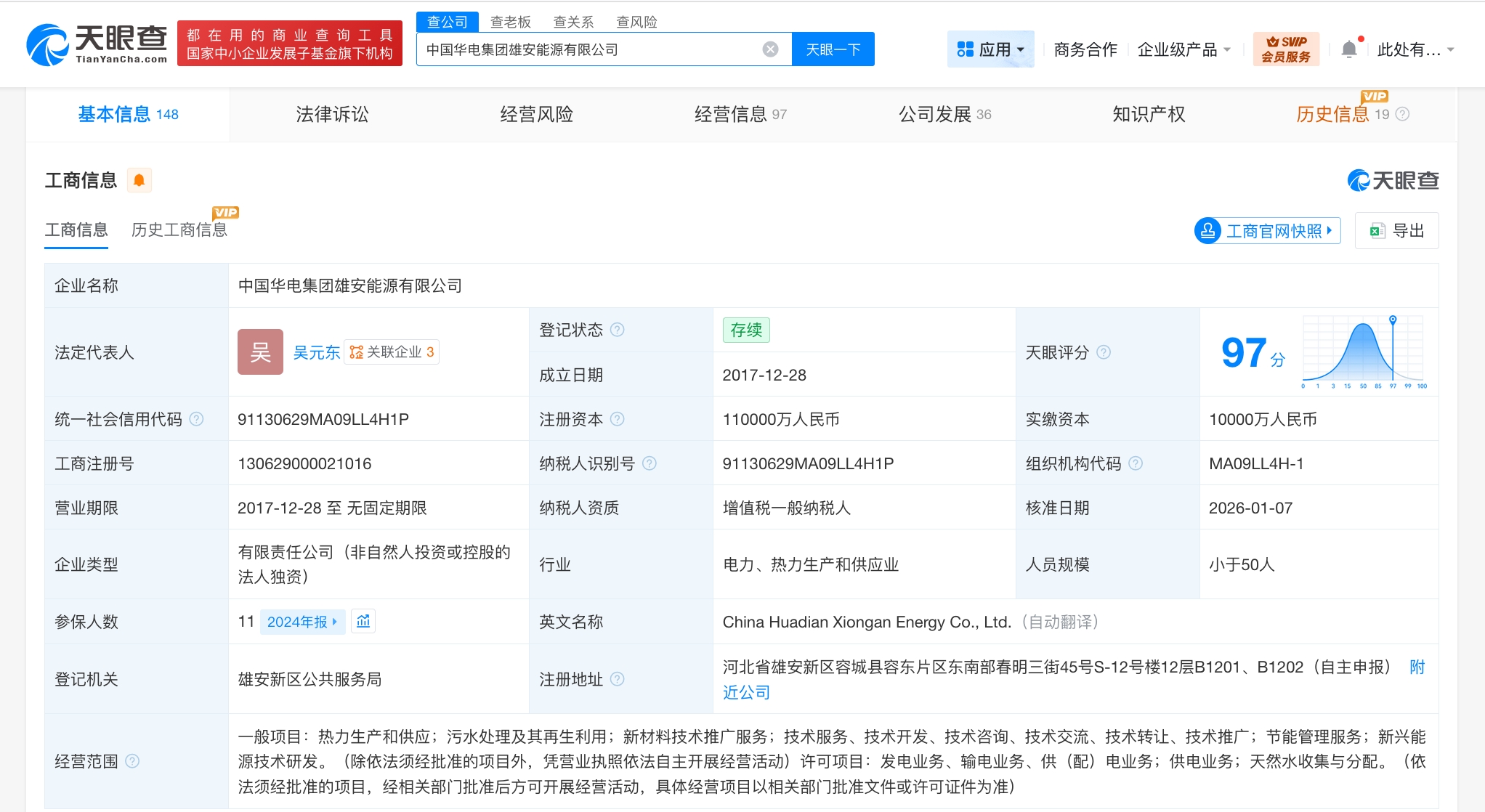 天眼查工商信息显示,近日,中国华电集团雄安能源有限公司发生工商变更,注册资本由1亿人民币增至11亿人民币,增幅1000%。
