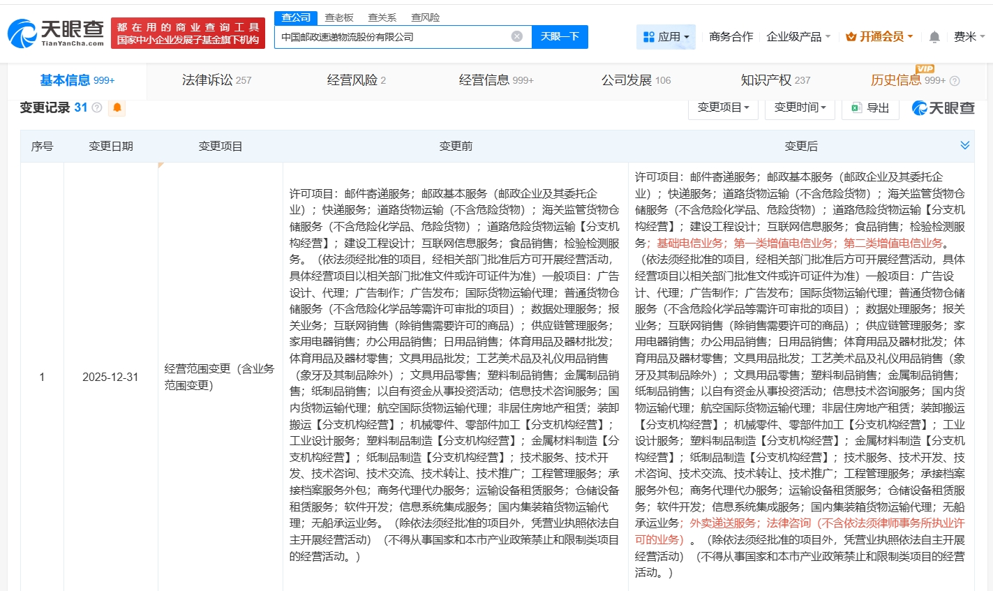天眼查工商信息显示,近日,中国邮政速递物流股份有限公司发生工商变更,经营范围新增基础电信业务、第一类增值电信业务、外卖递送服务等,注册资本由约298.4亿人民币增至约328.6亿人民币,增幅约10%,同时,多位主要人员发生变更。