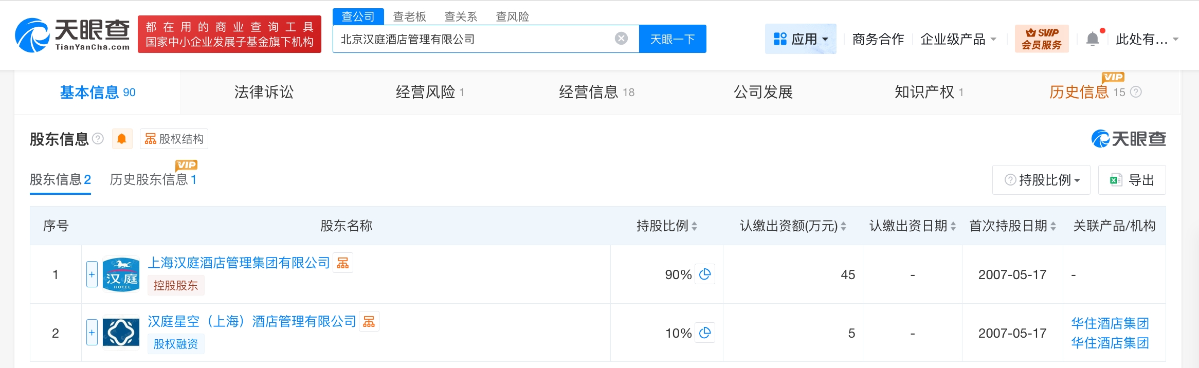 该公司成立于2007年5月,法定代表人为陈安东,注册资本50万人民币,经营范围为销售食品、限分支机构经营、住宿、酒店管理、投资信息咨询、会议服务、销售日用百货。股东信息显示,该公司由上海汉庭酒店管理集团有限公司、汉庭星空(上海)酒店管理有限公司共同持股。