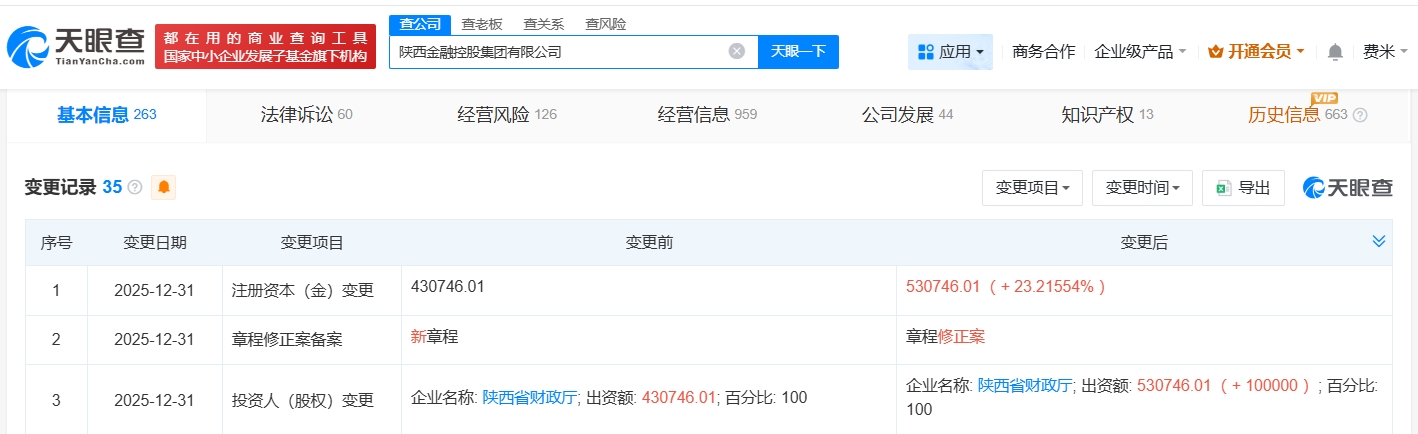 天眼查工商信息显示,近日,陕西金融控股集团有限公司发生工商变更,注册资本由约43.1亿人民币增至约53.1亿人民币,增幅约23%。