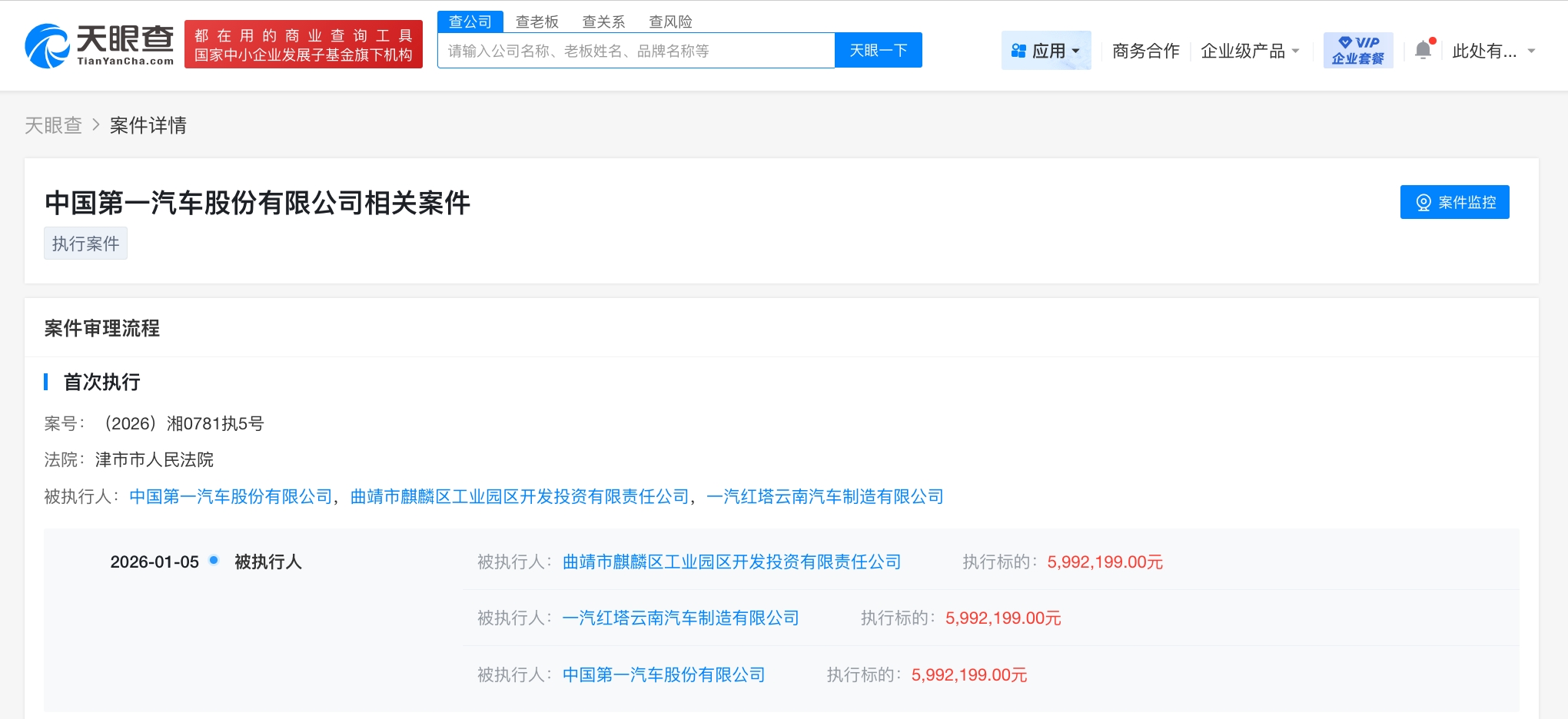 天眼查天眼风险信息显示,近日,中国第一汽车股份有限公司、曲靖市麒麟区工业园区开发投资有限责任公司、一汽红塔云南汽车制造有限公司新增一则被执行人信息,执行标的599万余元人民币,执行法院为津市市人民法院。