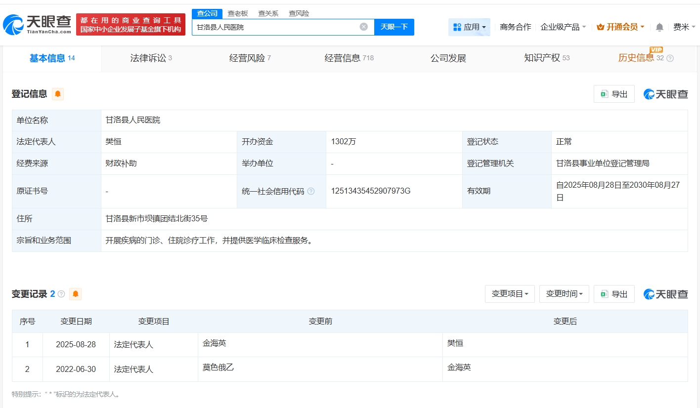 天眼查工商信息显示,涉事医院甘洛县人民医院开办资金1302万,宗旨和业务范围为开展疾病的门诊、住院诊疗工作,并提供医学临床检查服务。变更记录显示,去年8月,金海英卸任该医院法定代表人,由樊恒接任。天眼风险信息显示,该医院曾因医疗损害责任纠纷被起诉。此外,该医院曾因不合理收费、不合理检查、重复检查等被多次处罚。