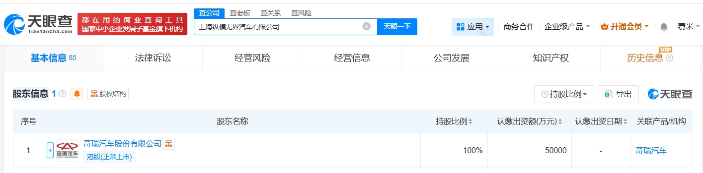 天眼查工商信息显示,1月6日,上海纵横无界汽车有限公司成立,法定代表人为刘永,注册资本5亿人民币,经营范围包括汽车销售、汽车零配件零售、汽车装饰用品销售、润滑油销售等。股东信息显示,该公司由奇瑞汽车股份有限公司全资持股。
