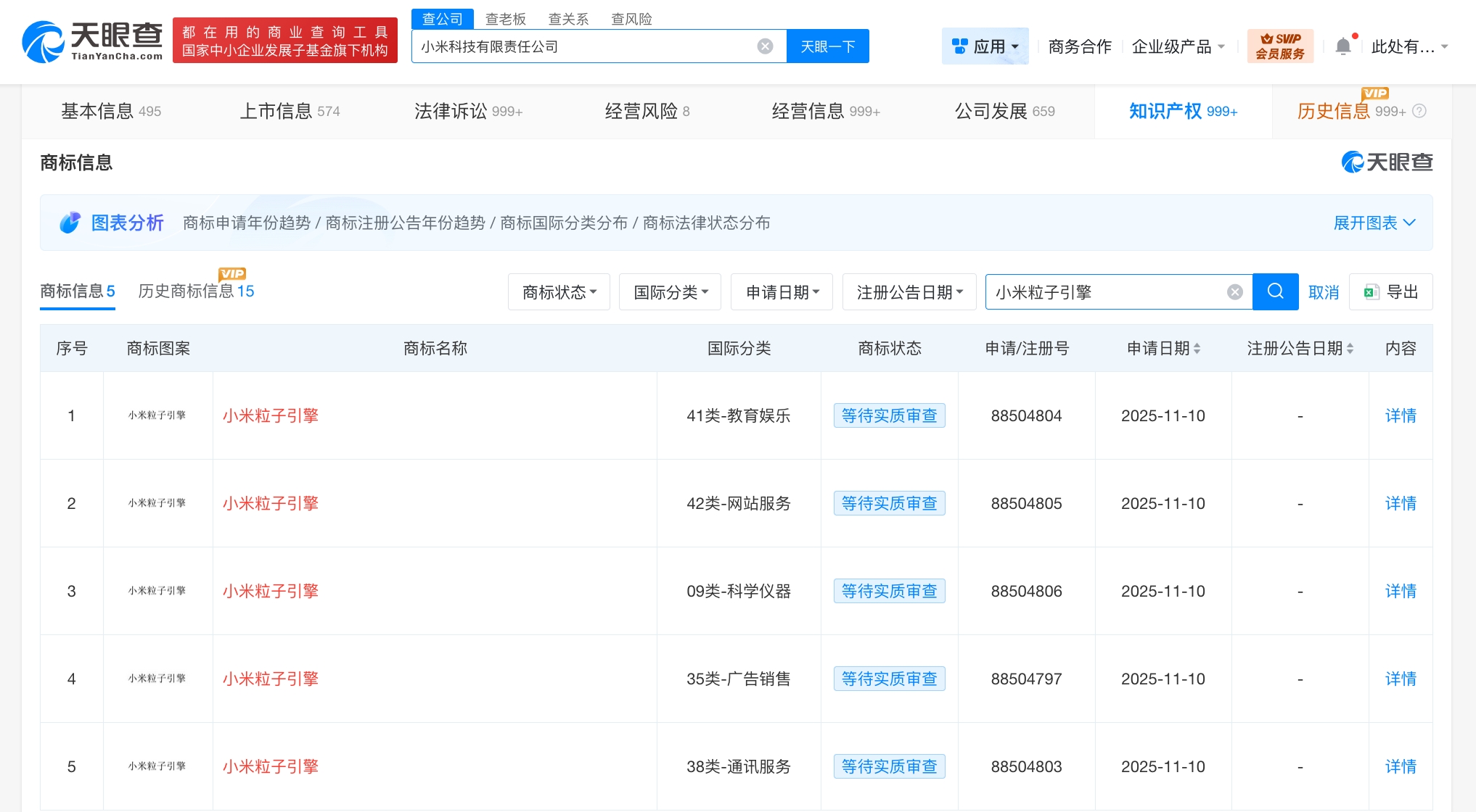 天眼查知识产权信息显示,近期,小米科技有限责任公司申请注册“小米粒子引擎”商标,国际分类为科学仪器、网站服务、通讯服务等,当前商标状态均为等待实质审查。
