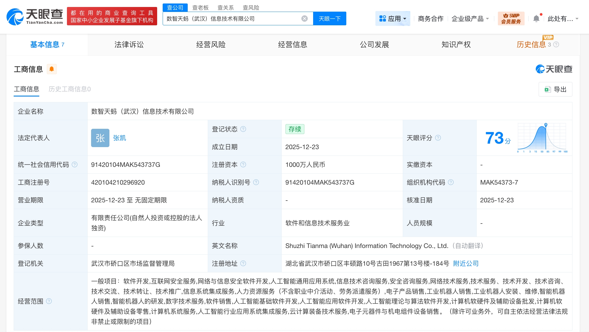 天眼查工商信息显示,近日,数智天蚂(武汉)信息技术有限公司成立,法定代表人为张凯,注册资本1000万人民币,经营范围含软件开发、互联网安全服务、网络与信息安全软件开发、人工智能通用应用系统、信息技术咨询服务、网络技术服务、智能机器人销售、智能机器人的研发、人工智能基础软件开发等。股东信息显示,该公司由蚂蚁数科旗下蚂蚁数动未来(北京)科技有限公司全资持股。