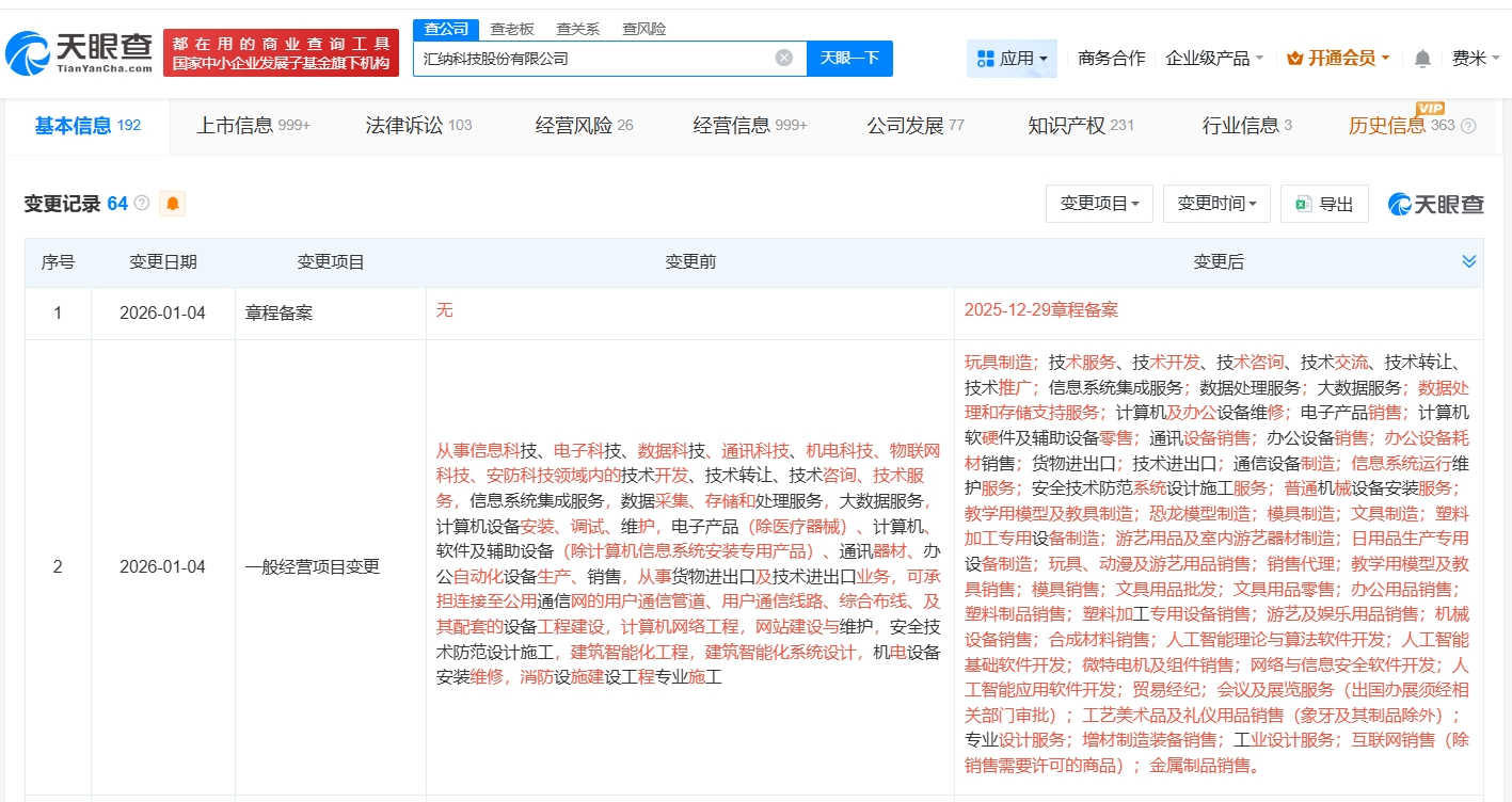 天眼查工商信息显示,近日,汇纳科技(300609)发生工商变更,经营范围新增人工智能理论与算法软件开发、人工智能基础软件开发、人工智能应用软件开发等。