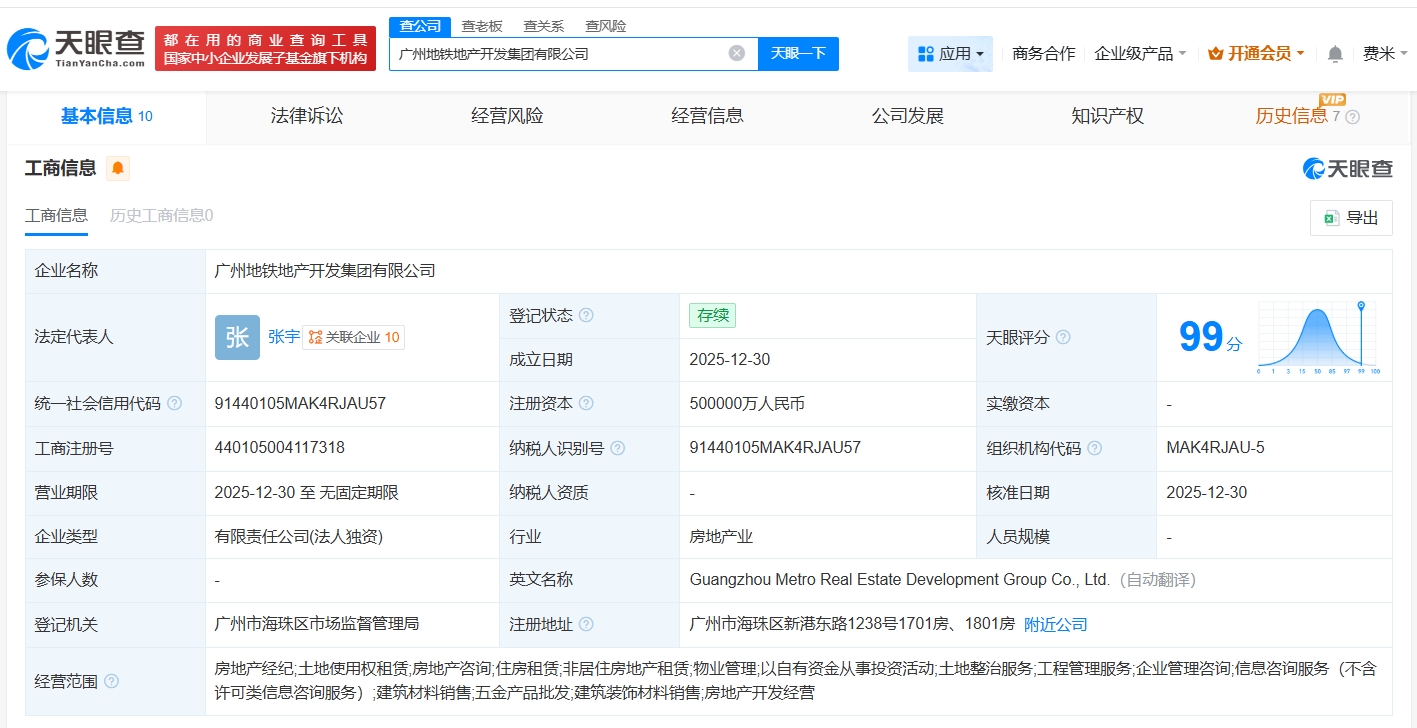 天眼查工商信息显示,近日,广州地铁地产开发集团有限公司成立,法定代表人为张宇,注册资本50亿人民币,经营范围包括房地产经纪、土地使用权租赁、房地产咨询、住房租赁等。股东信息显示,该公司由广州地铁集团有限公司全资持股。
