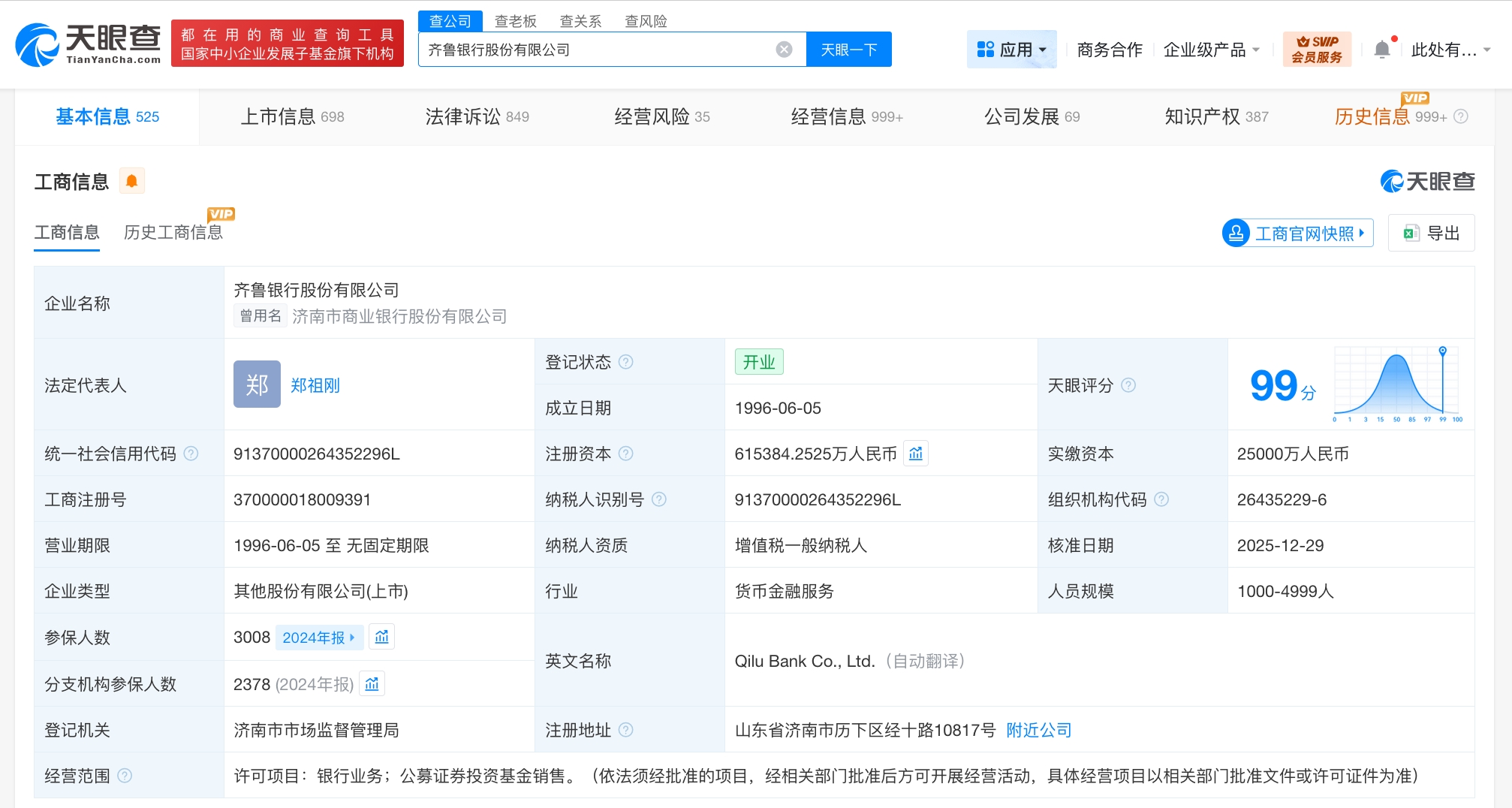 天眼查工商信息显示,近日,齐鲁银行(601665)发生工商变更,注册资本由约47.1亿人民币增至约61.5亿人民币,增幅约31%。