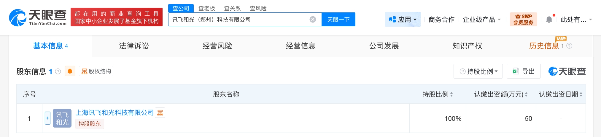 天眼查工商信息显示,近日,讯飞和光(郑州)科技有限公司成立,法定代表人为王鑫,注册资本50万人民币,经营范围含信息技术咨询服务、软件开发、农产品智能物流装备销售、信息系统集成服务、物联网设备销售、智能机器人的研发、人工智能应用软件开发、人工智能基础软件开发、人工智能通用应用系统等。股东信息显示,该公司由科大讯飞旗下上海讯飞和光科技有限公司全资持股。