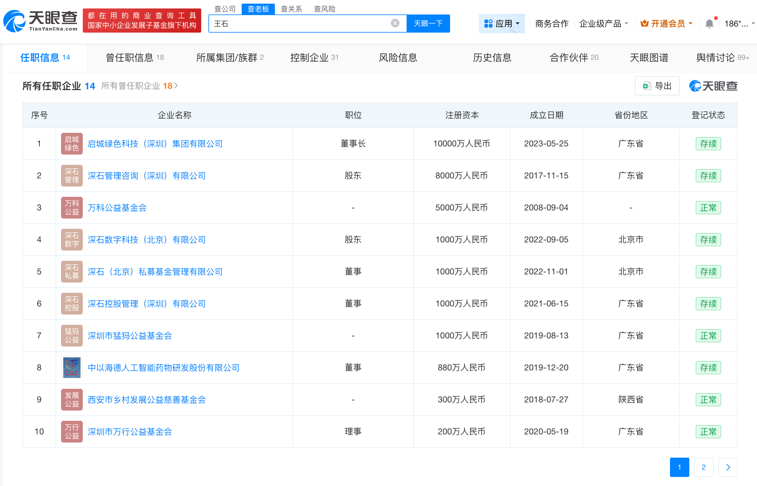天眼查任职信息显示,田朴珺名下共关联5家存续企业,包括深圳市圣朴骏辉健康管理有限公司、北京承礼文化传媒有限公司等。王石名下共关联14家企业,其中启城绿色科技(深圳)集团有限公司、深石管理咨询(深圳)有限公司等企业为存续或开业状态。查关系信息显示,田朴珺与王石无直接商业关联。