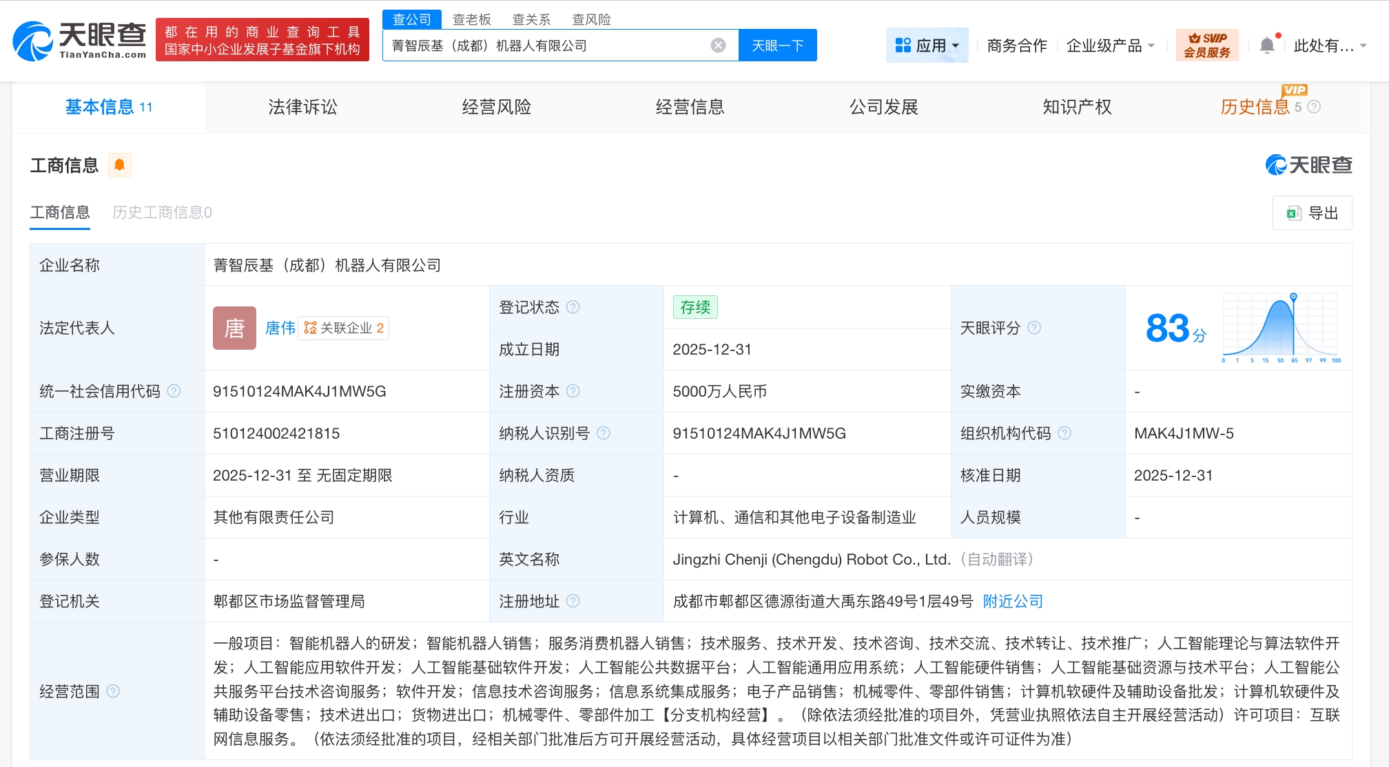 天眼查工商信息显示,近日,菁智辰基(成都)机器人有限公司成立,法定代表人为唐伟,注册资本5000万人民币,经营范围含智能机器人的研发、智能机器人销售、服务消费机器人销售、人工智能理论与算法软件开发、人工智能应用软件开发、人工智能基础软件开发、人工智能公共服务平台技术咨询服务、信息技术咨询服务等。股东信息显示,该公司由成都菁创产业投资发展有限公司、智元创新(上海)科技股份有限公司共同持股。