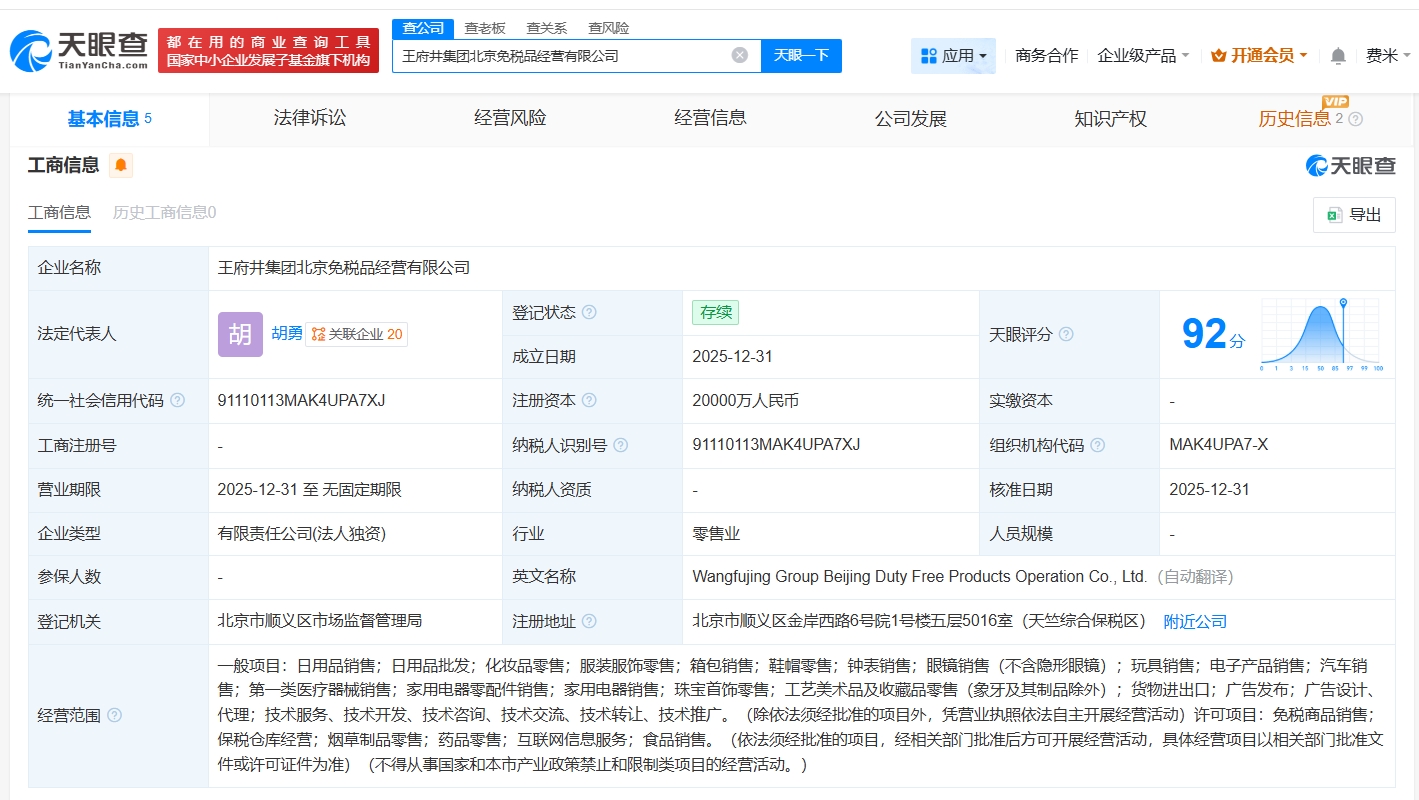 天眼查工商信息显示,近日,王府井集团北京免税品经营有限公司成立,法定代表人为胡勇,注册资本2亿人民币,经营范围包括日用品销售、日用品批发、化妆品零售、服装服饰零售等。股东信息显示,该公司由王府井(600859)全资持股。