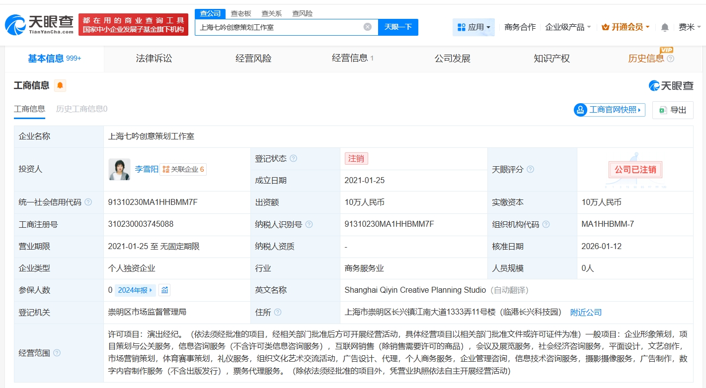上海七吟创意策划工作室成立于2021年1月,投资人为李雪琴(本名李雪阳),出资额10万人民币,经营范围包括演出经纪、企业形象策划、项目策划与公关服务等。值得一提的是,目前,李雪琴名下公司均已注销。
