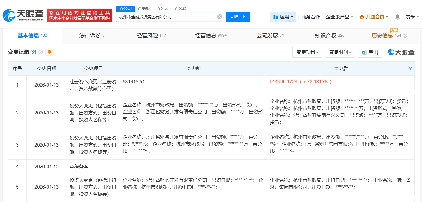 天眼查工商信息显示,近日,杭州市金融投资集团有限公司发生工商变更,注册资本由约53.1亿人民币增至约91.5亿人民币,增幅约72%。