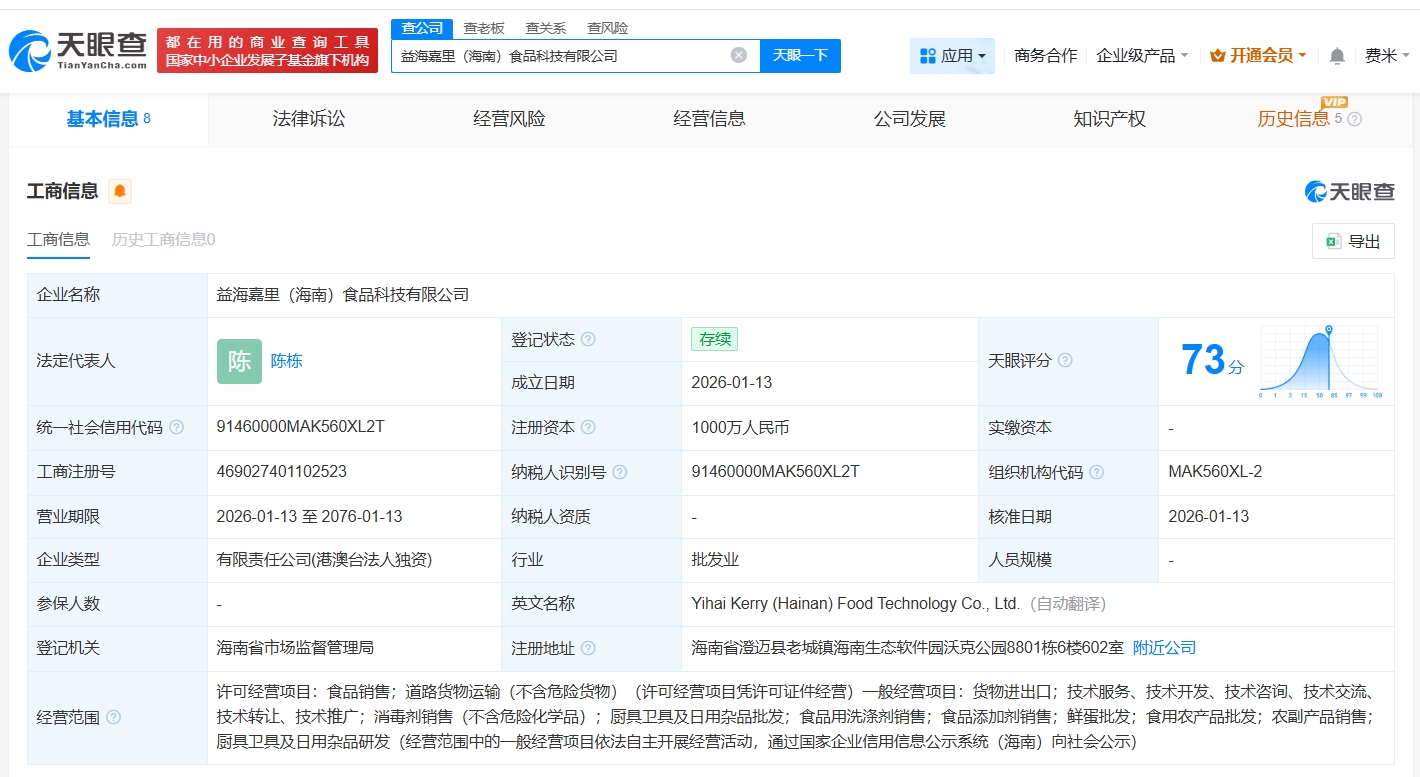 天眼查工商信息显示,近日,益海嘉里(海南)食品科技有限公司成立,法定代表人为陈栋,注册资本1000万人民币,经营范围包括食品销售、道路货物运输、货物进出口等。股东信息显示,该公司由金龙鱼(300999)全资持股。