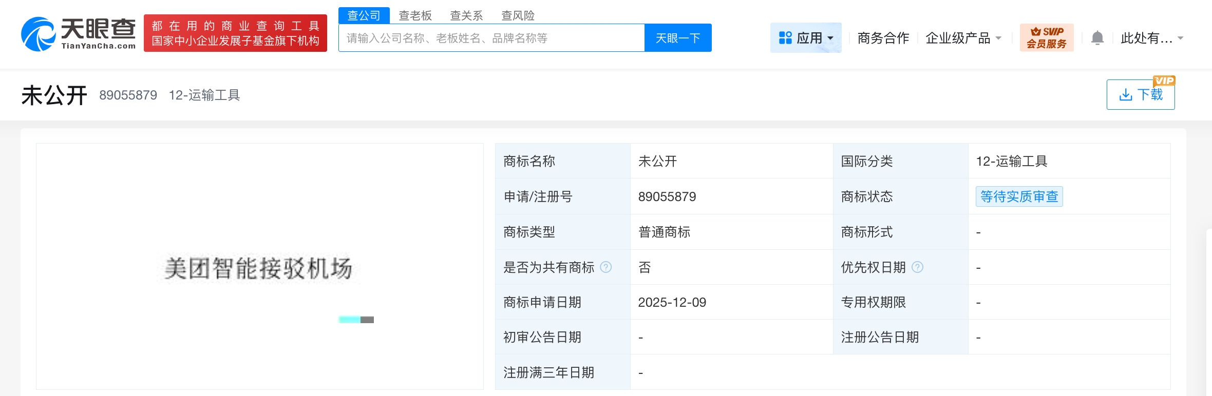 天眼查知识产权信息显示,近日,美团关联公司北京三快科技有限公司申请注册多枚“美团智能接驳机场”“美团无人机玄武云”“美团无人机云枢”“美团无人机低空航网”等商标,国际分类包括运输工具、运输贮藏等,当前商标状态均为等待实质审查。