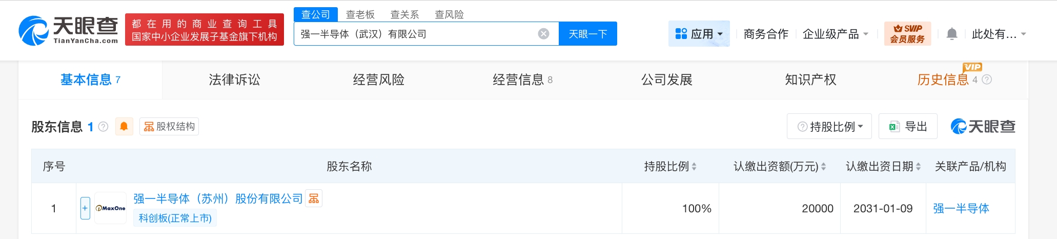 天眼查工商信息显示,近日,强一半导体(武汉)有限公司成立,法定代表人为周明,注册资本2亿人民币,经营范围含半导体器件专用设备制造、半导体器件专用设备销售、集成电路设计、集成电路芯片及产品制造、集成电路芯片及产品销售、半导体分立器件销售等。股东信息显示,该公司由强一股份(688809)全资持股。