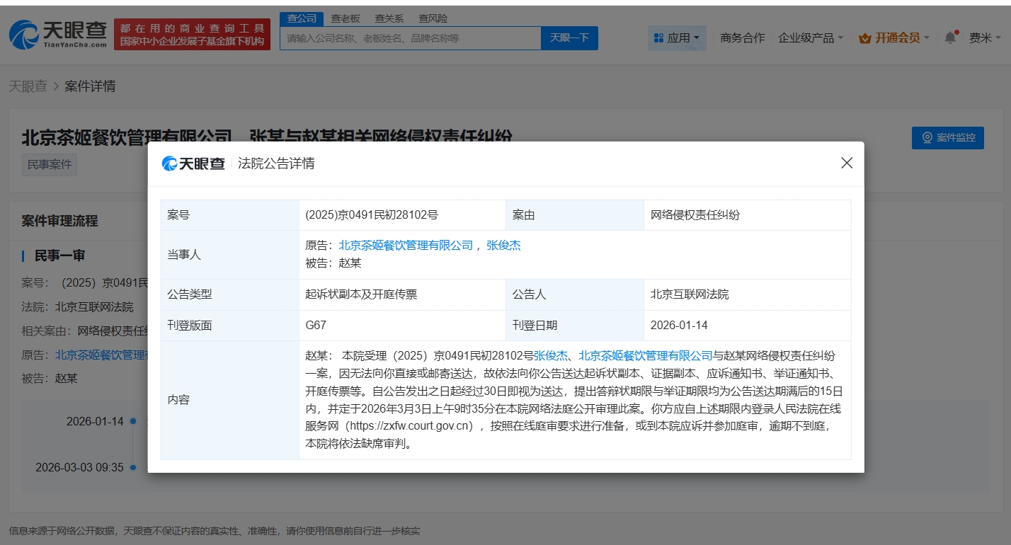 天眼查天眼风险信息显示,近日,北京互联网法院向赵某公告送达原告霸王茶姬关联公司北京茶姬餐饮管理有限公司、创始人张俊杰与其网络侵权责任纠纷案件起诉状副本、开庭传票等,自公告发出之日起经过30日即视为送达,该案将定于3月3日开庭审理。