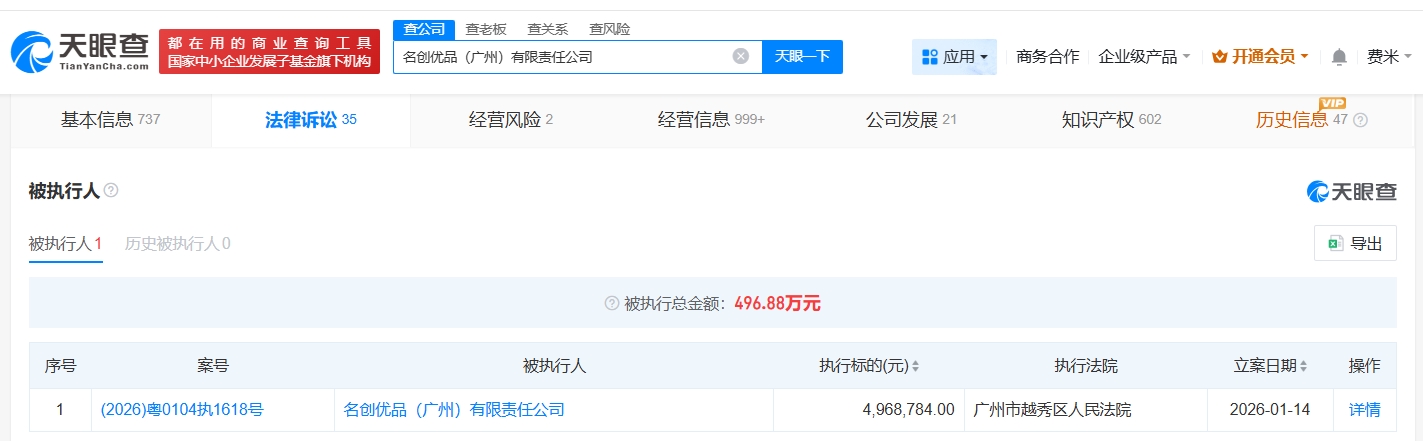 天眼查天眼风险信息显示,近日,名创优品关联公司名创优品(广州)有限责任公司新增一则被执行人信息,执行标的496万余元,执行法院为广州市越秀区人民法院。