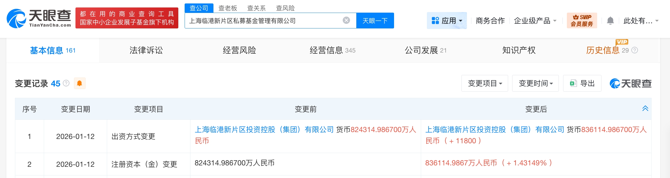 天眼查工商信息显示,近日,上海临港新片区私募基金管理有限公司发生工商变更,注册资本由约82.4亿人民币增至约83.6亿人民币。