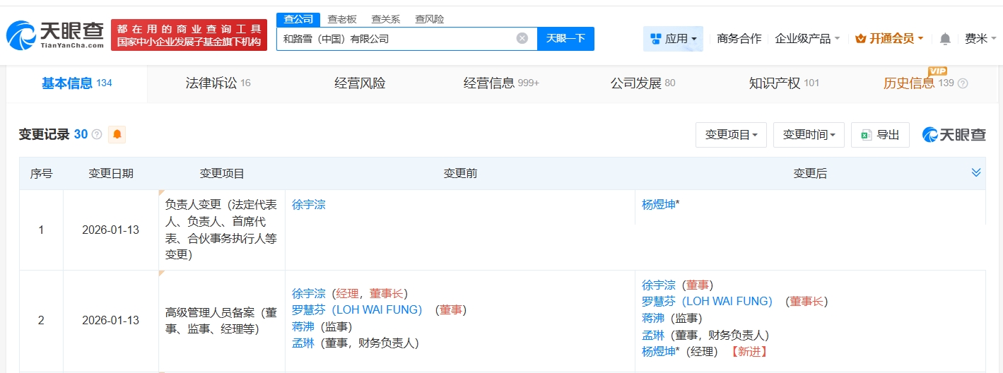 天眼查工商信息显示,近日,和路雪(中国)有限公司发生工商变更,徐宇淙由法定代表人、经理、董事长改任董事,杨煜坤接替法定代表人、经理,罗慧芬(LOH WAI FUNG)接任董事长。