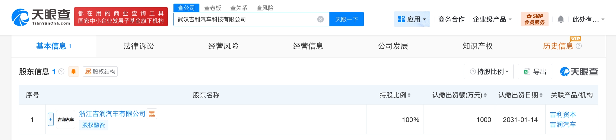 天眼查工商信息显示,近日,武汉吉利汽车科技有限公司成立,法定代表人为娄源发,注册资本1000万人民币,经营范围含科技中介服务、汽车零部件及配件制造、汽车零配件批发、合成材料制造、汽车零部件研发、信息技术咨询服务、新能源汽车整车销售等。股东信息显示,该公司由浙江吉润汽车有限公司全资持股。