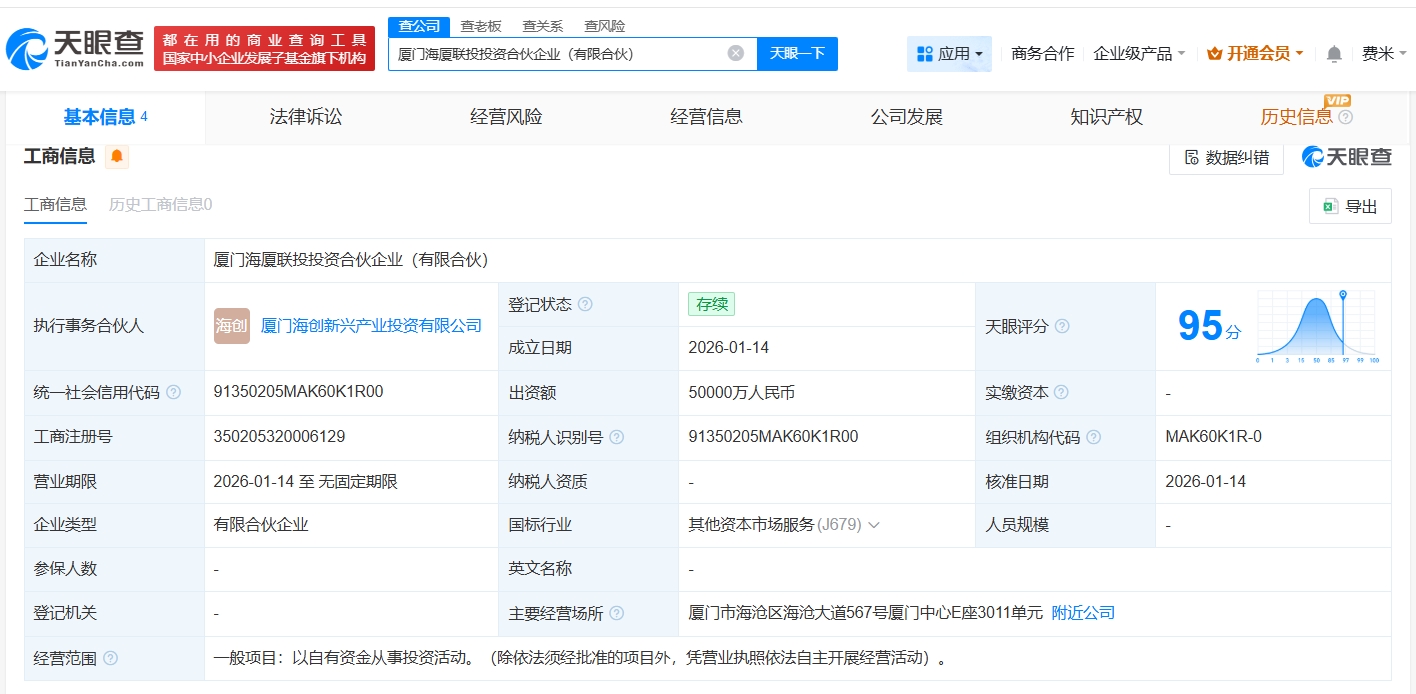 天眼查工商信息显示,近日,厦门海厦联投投资合伙企业(有限合伙)成立,出资额5亿人民币,经营范围为以自有资金从事投资活动。合伙人信息显示,该合伙企业由厦门半导体投资集团有限公司、厦门海创新兴产业投资有限公司共同出资。