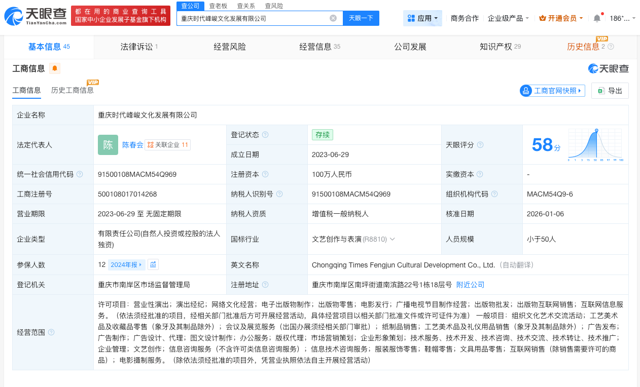 重庆时代峰峻文化发展有限公司成立于2023年6月,法定代表人为陈春会,注册资本100万人民币,经营范围包括营业性演出、演出经纪、网络文化经营、电子出版物制作等,由北京时代峰峻文化艺术发展有限公司全资持股。