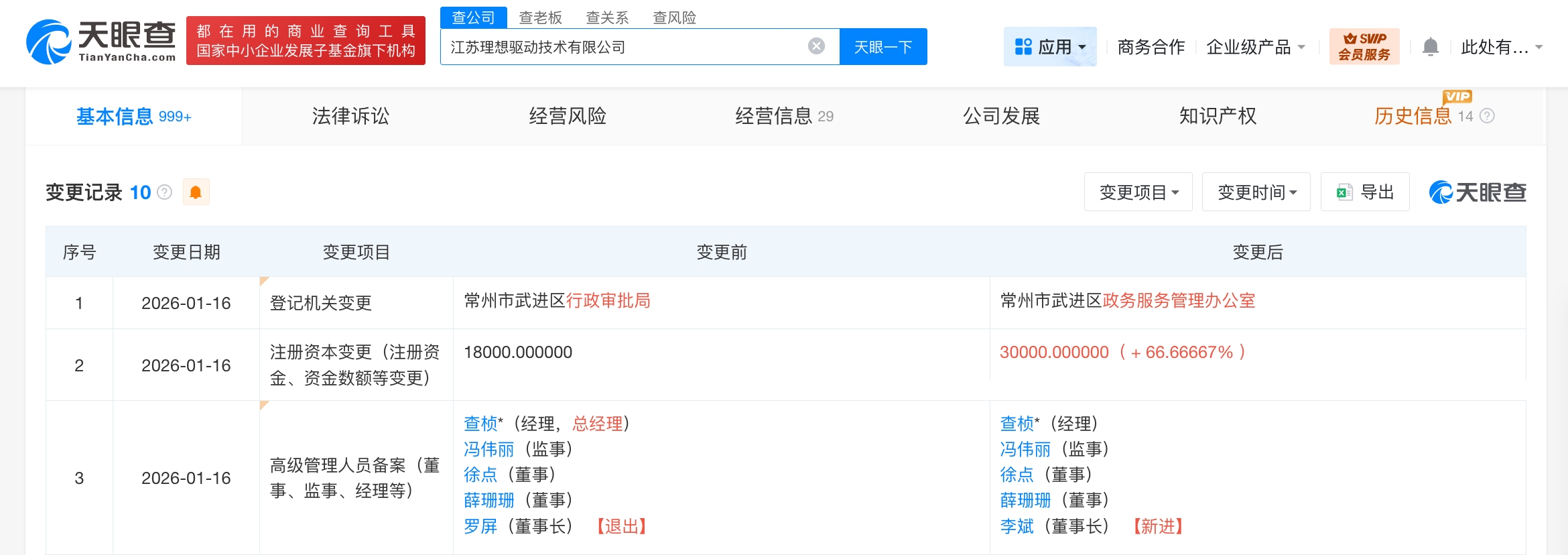 天眼查工商信息显示,近日,江苏理想驱动技术有限公司发生工商变更,注册资本由1.8亿人民币增至3亿人民币,增幅约67%,同时,部分高管也发生变更。